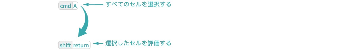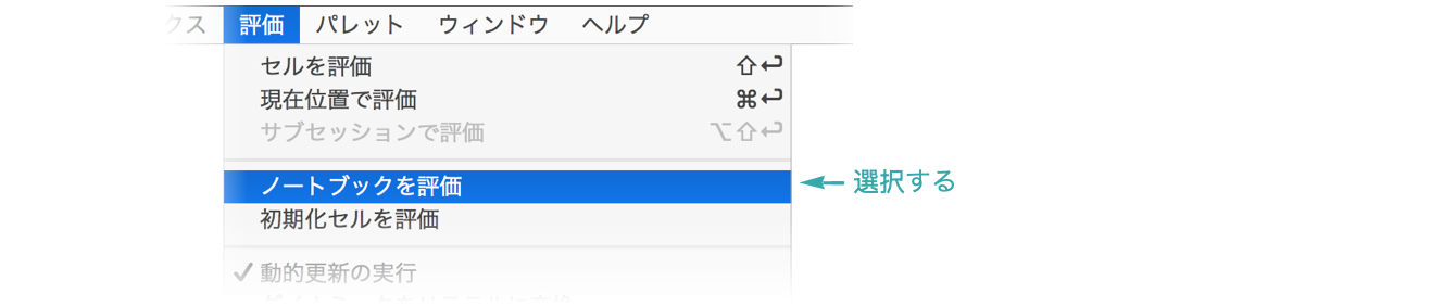 「評価」 ▶ 「ノートブックを評価」を選び,ノートブック内のすべてのセルを評価する: