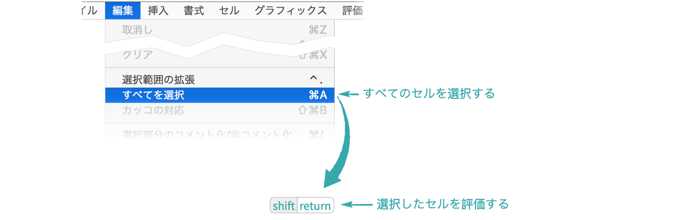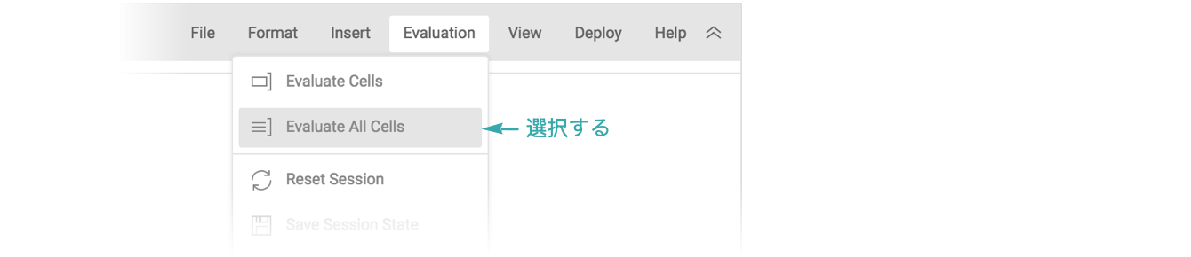 「Evaluation」 ▶ 「Evaluate All Cells」を選び,ノートブック内のすべてのセルを評価する: