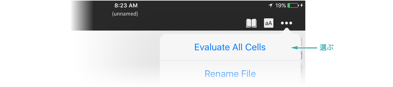 「...」 ▶ 「Evaluate All Cells」を選び,ノートブック内のすべてのセルを評価する: