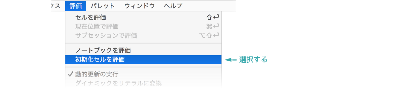 ノートブックの初期化セルのみを評価するためには,「評価」 ▶ 「初期化セルを評価」を選ぶ: