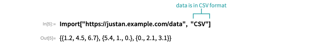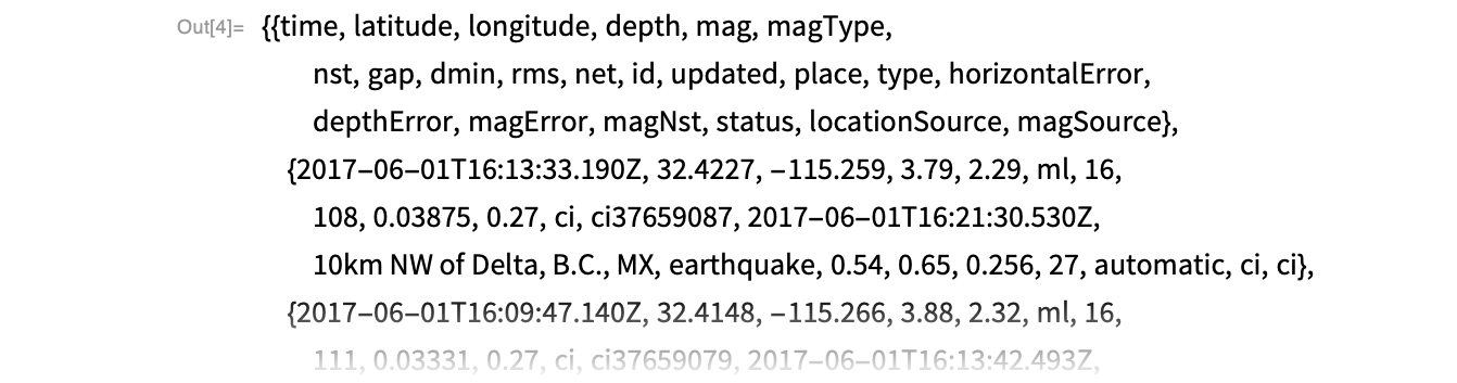 If a URL contains data in a format other than HTML, you can often import the data directly. Here is an import of earthquake data in "CSV" format, which is inferred from the “csv” extension: