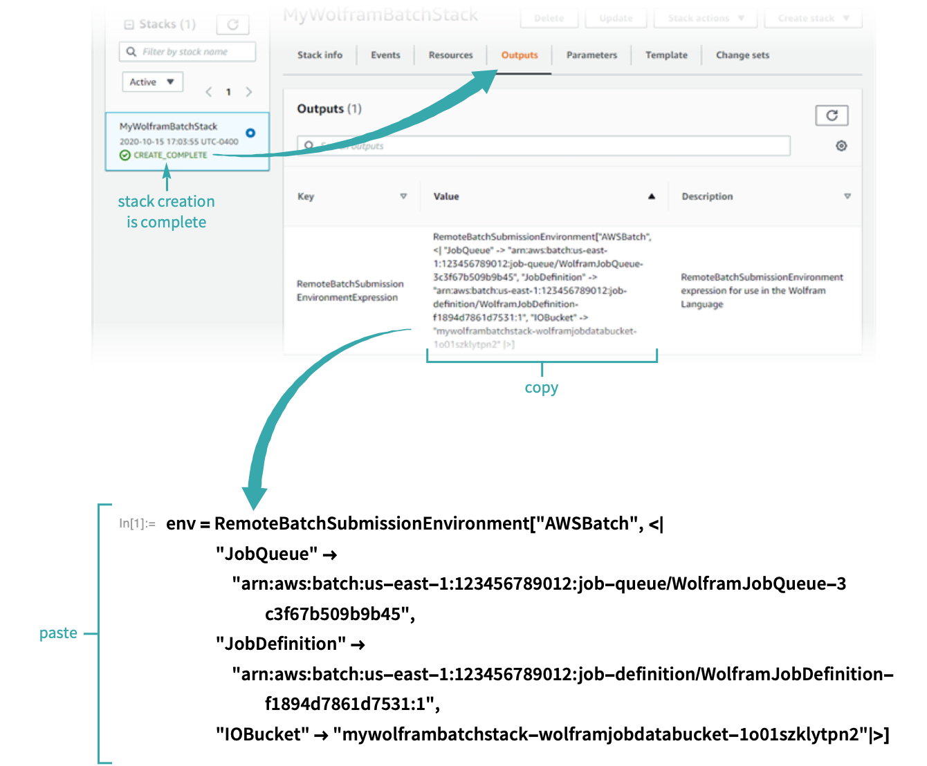 Once the stack has been fully created, navigate to the Outputs tab and copy the submission environment output to a notebook: