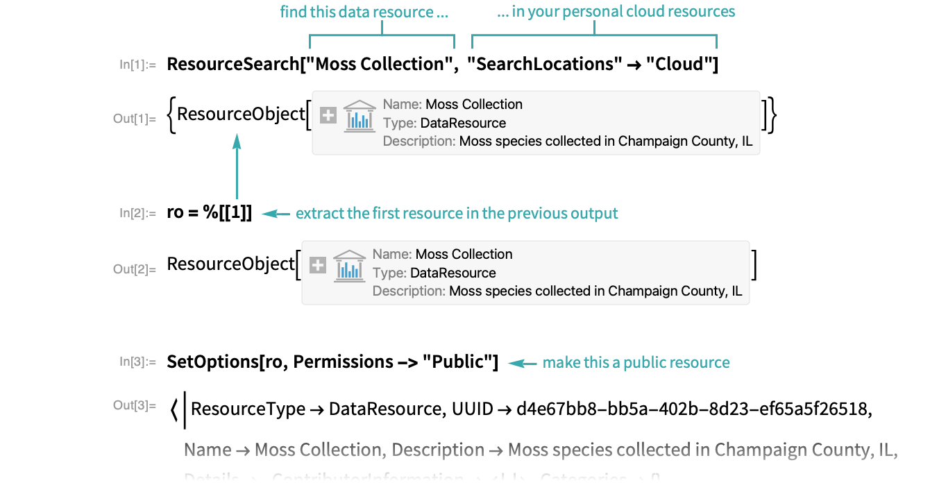 Locate the resource you want to publish using ResourceSearch and set its permissions to “Public” to give anyone access to it: