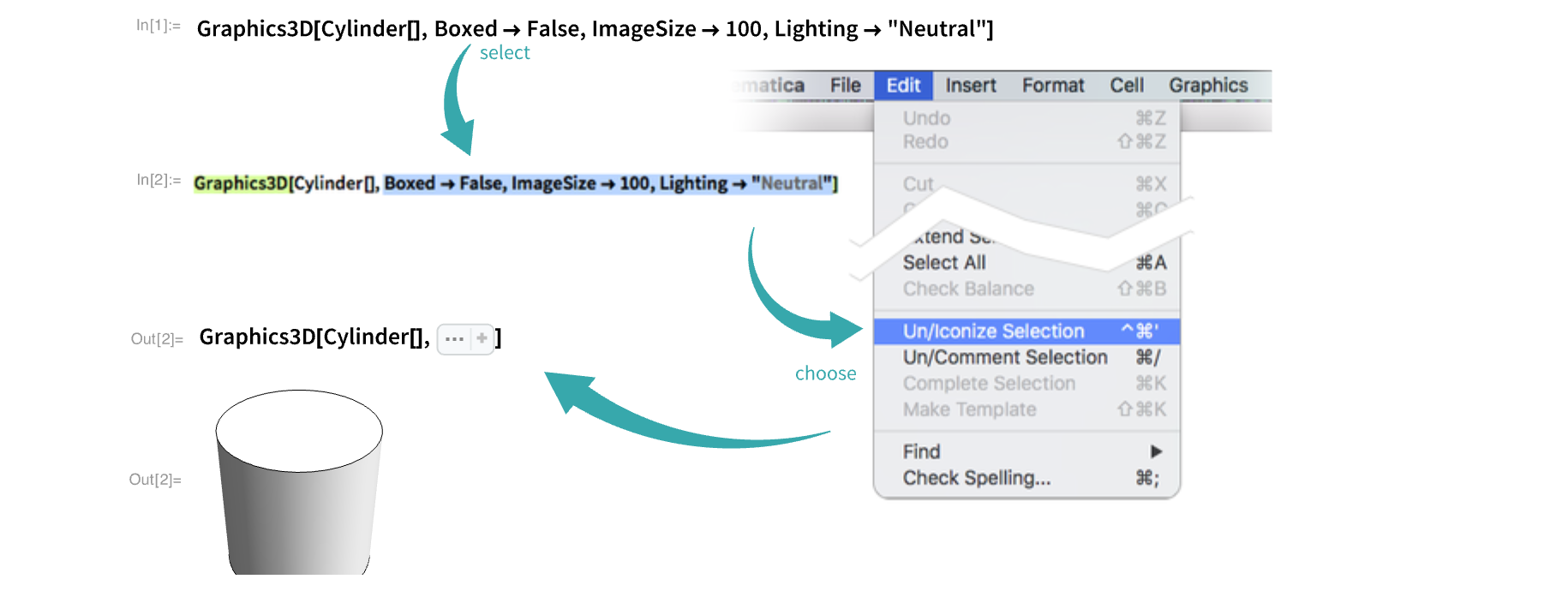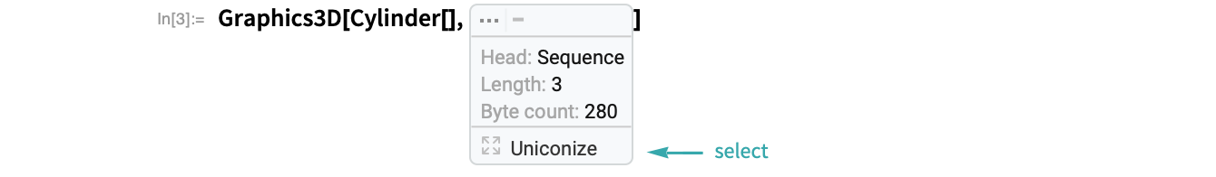 Select all or part of an expression and choose Edit ▶ Un/Iconize Selection to shorten it to a compact, iconized form. The shortened expression evaluates just like the expanded expression: