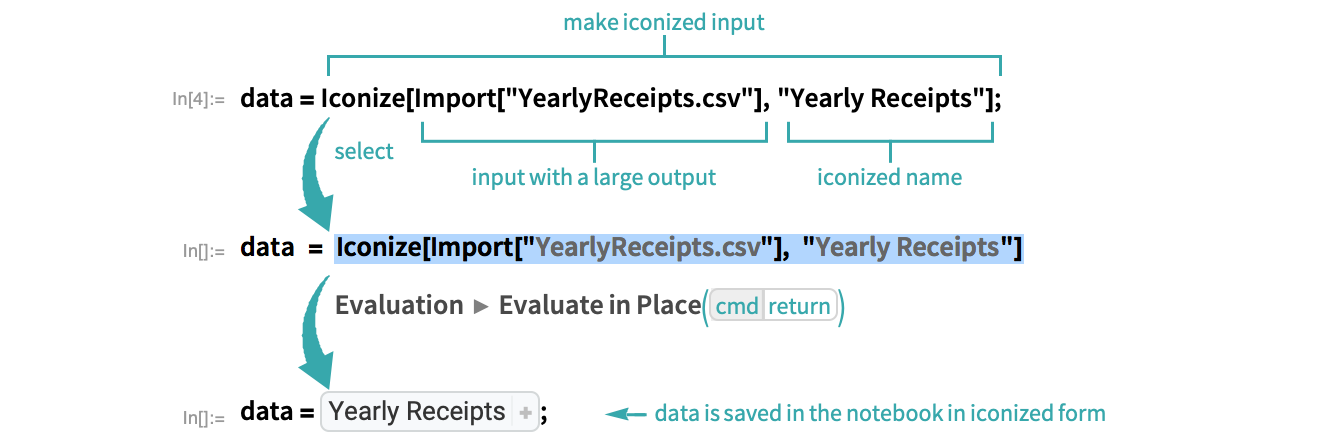 Preserve large datasets in notebooks in iconized form by wrapping the input expression with Iconize and evaluating in place: