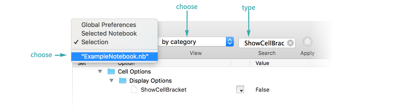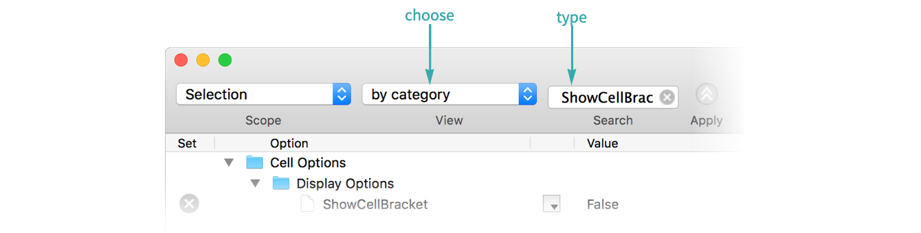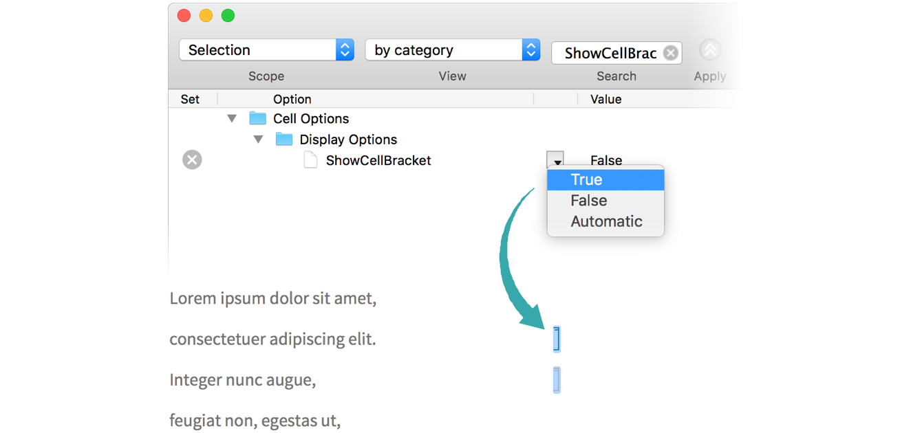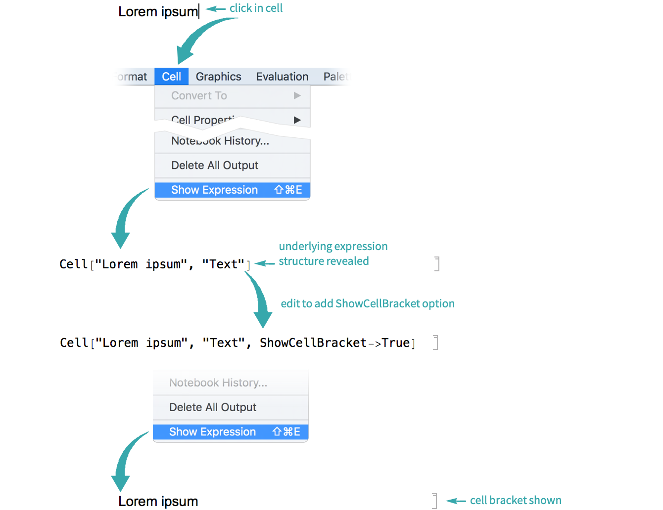 - If the Cell expression already contains a ShowCellBracket option, leave the option in place and change its value to True.