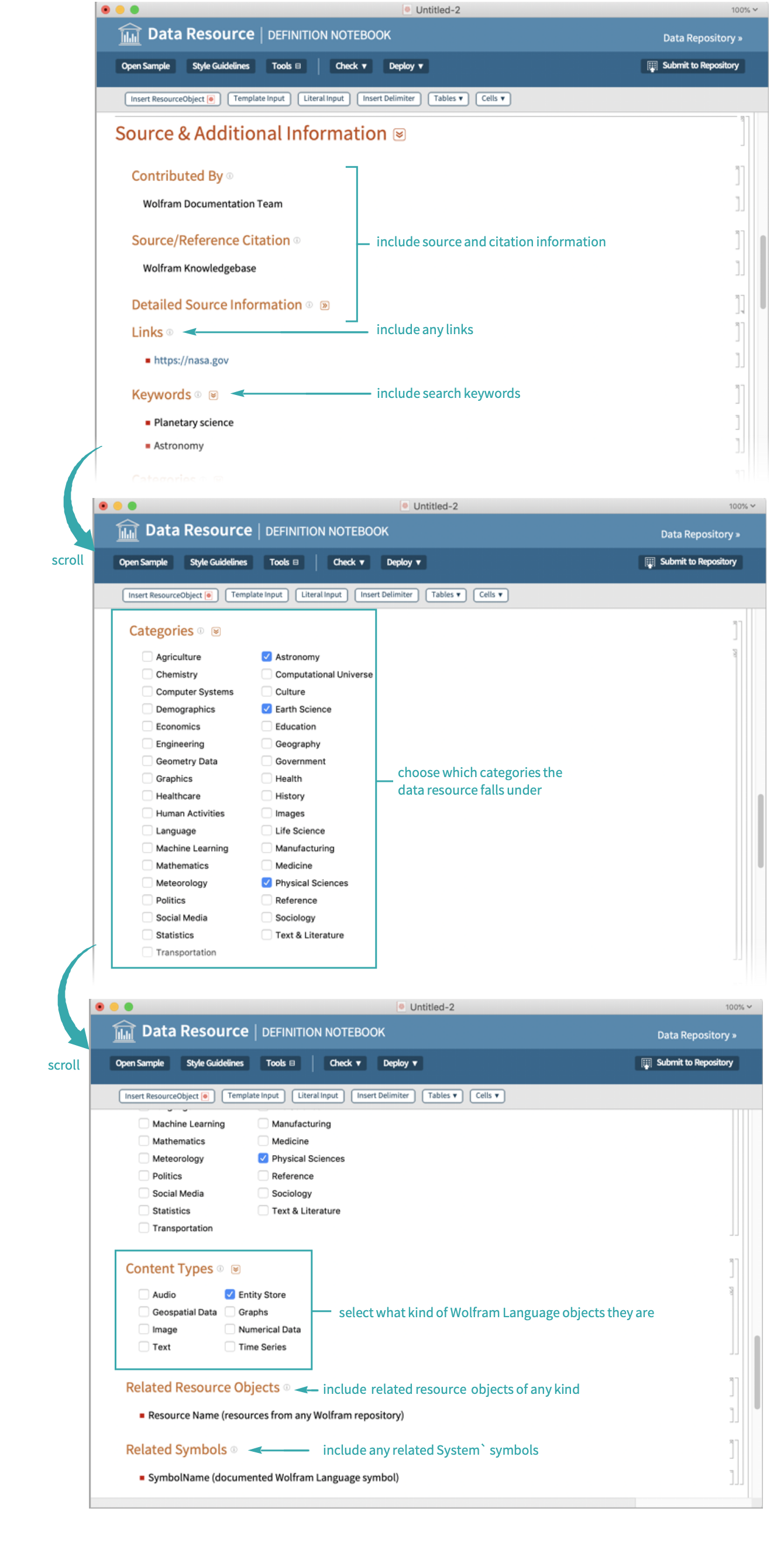 The Source & Additional Information section is optional for personal data resources, but required for submissions to the Wolfram Data Repository. Create a data resource and fill out the information in the Source & Additional Information section: