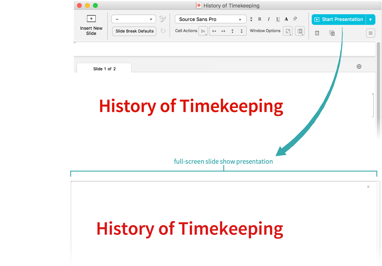 Use the Working environment to edit a presentation. Switch to the Presentation environment to present it.