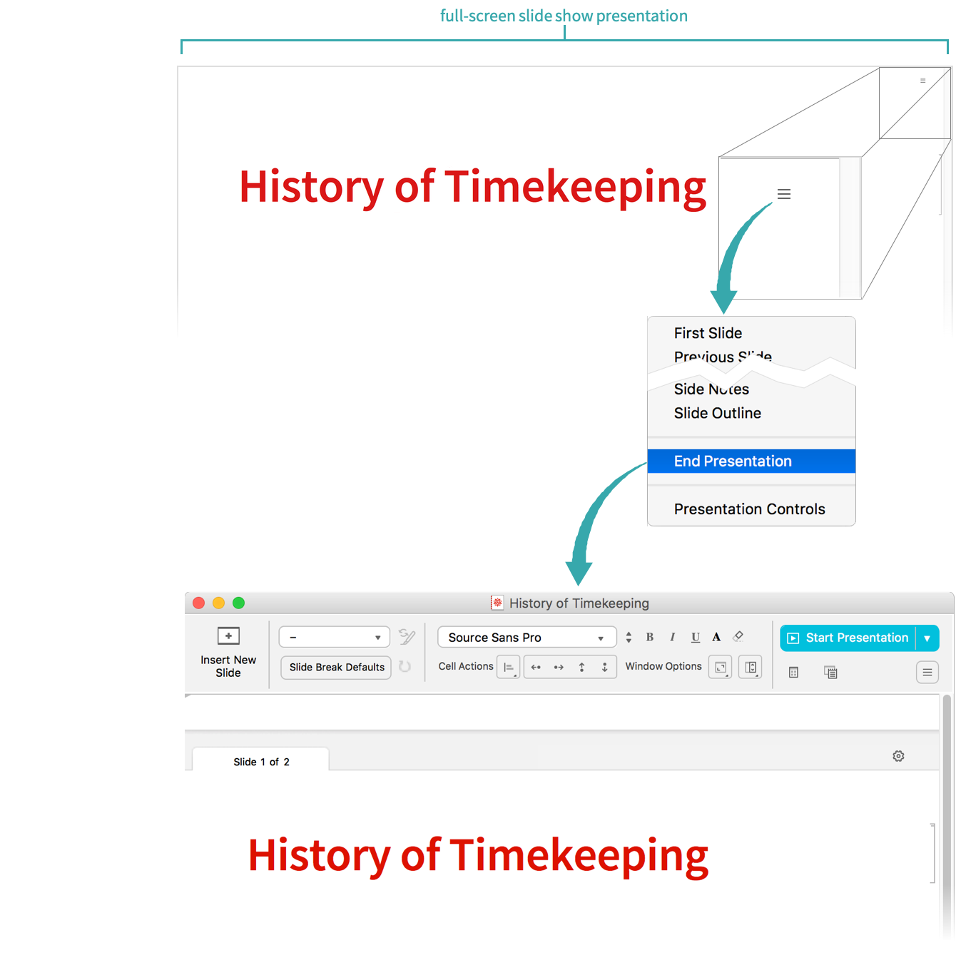 Choose Format ▶ Screen Environment ▶ Slideshow Working to end a presentation and return to working on it: