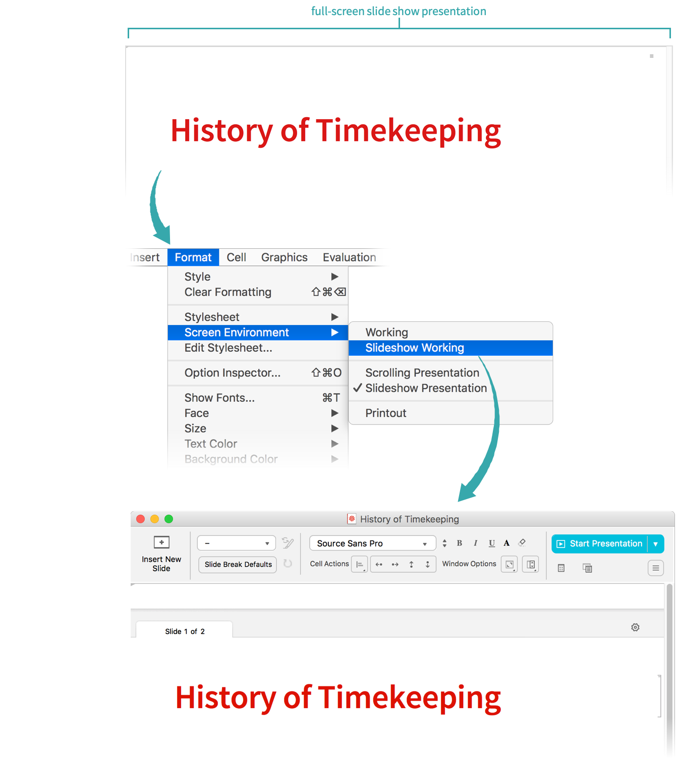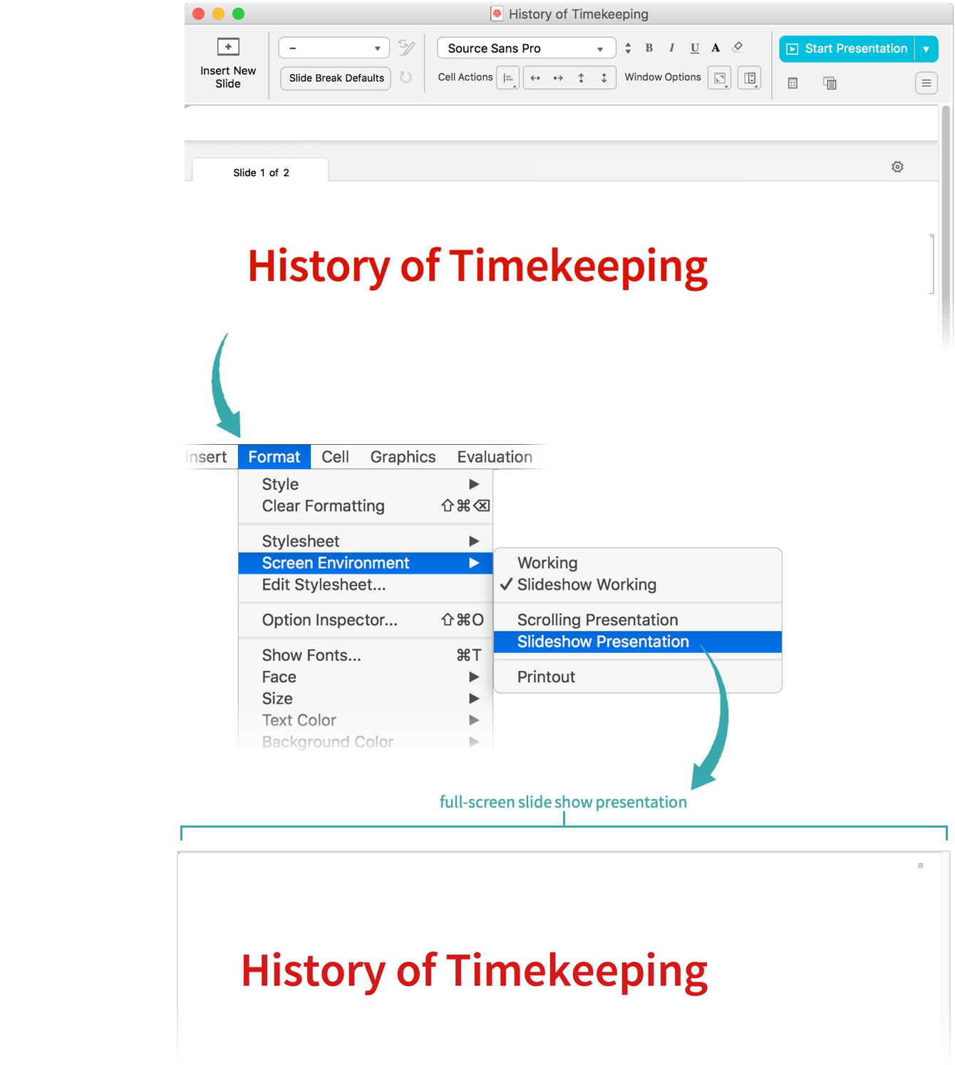Choose Format ▶ Screen Environment ▶ Slideshow Presentation to start a presentation: