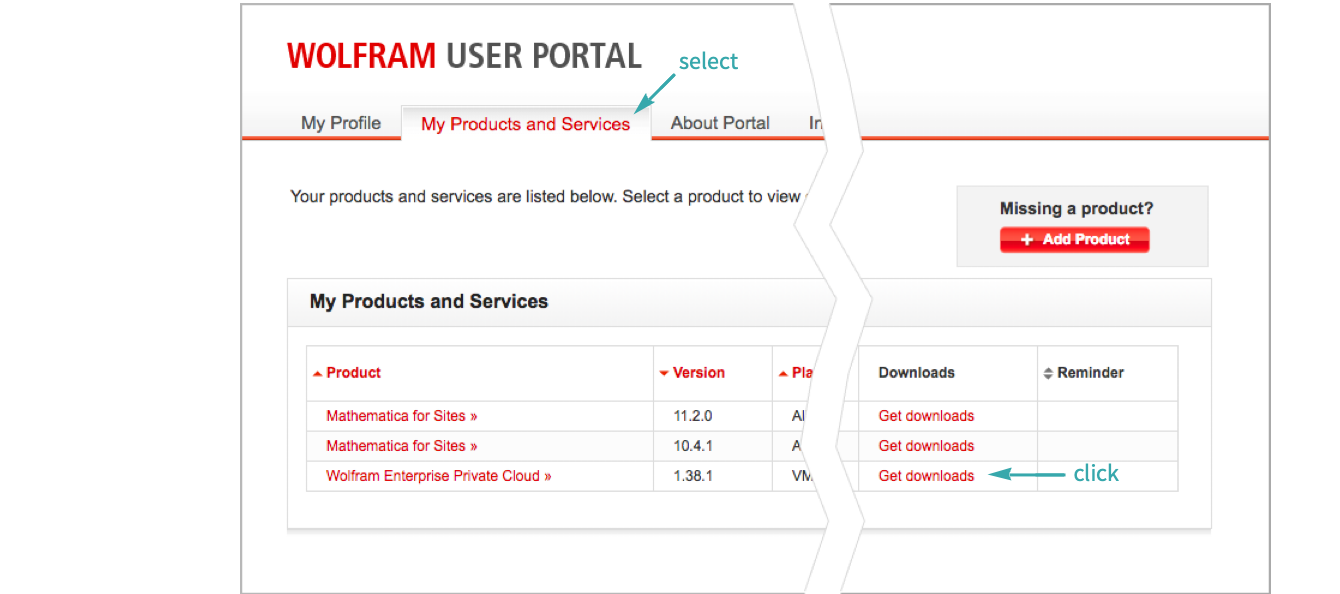 Select My Products and Services and click “Get downloads” for Wolfram Enterprise Private Cloud (EPC):
