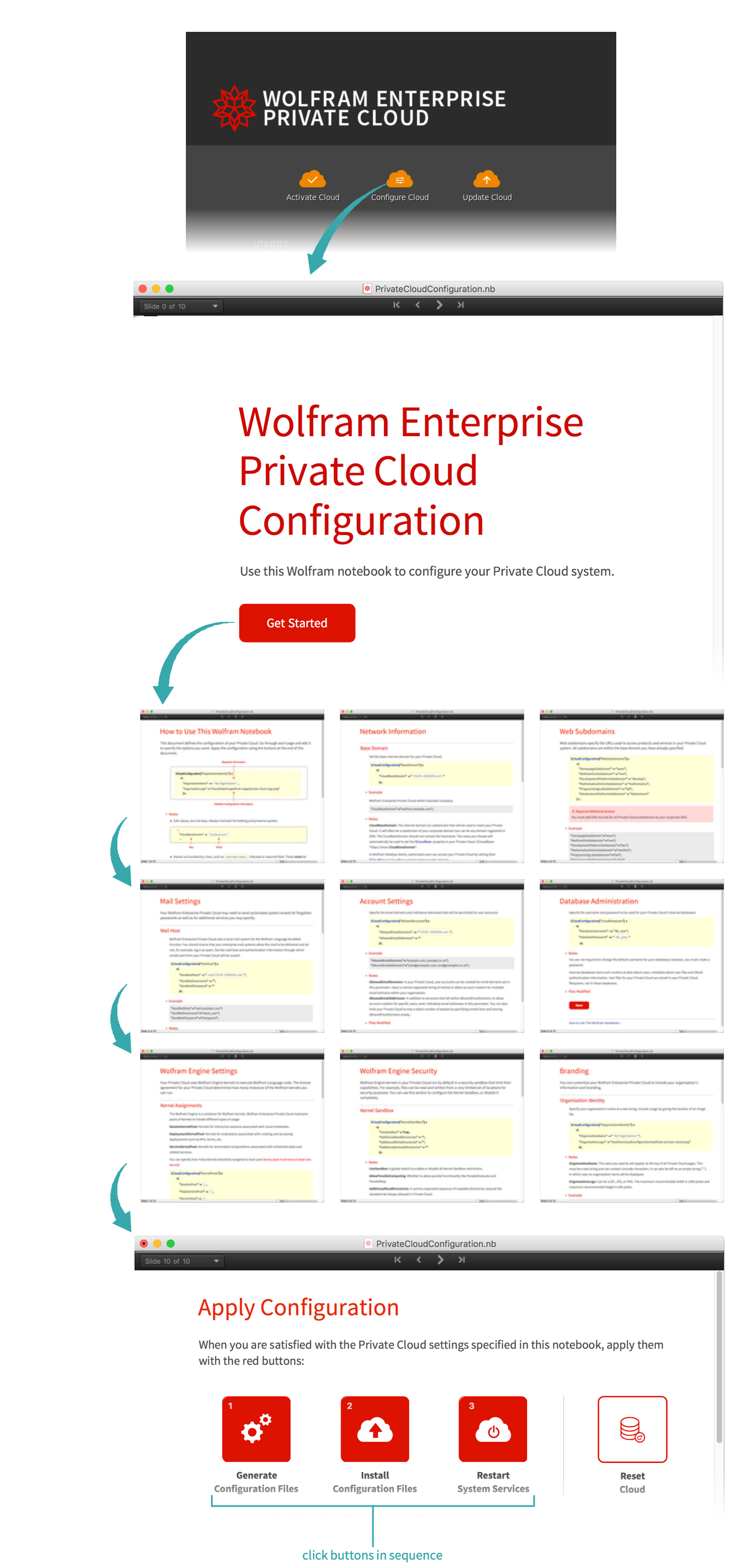 Once the update has completed, click Configure Cloud to open the configuration notebook. Check your configuration and make changes if desired. On the last page of the configuration notebook, click the three red configuration buttons consecutively:
