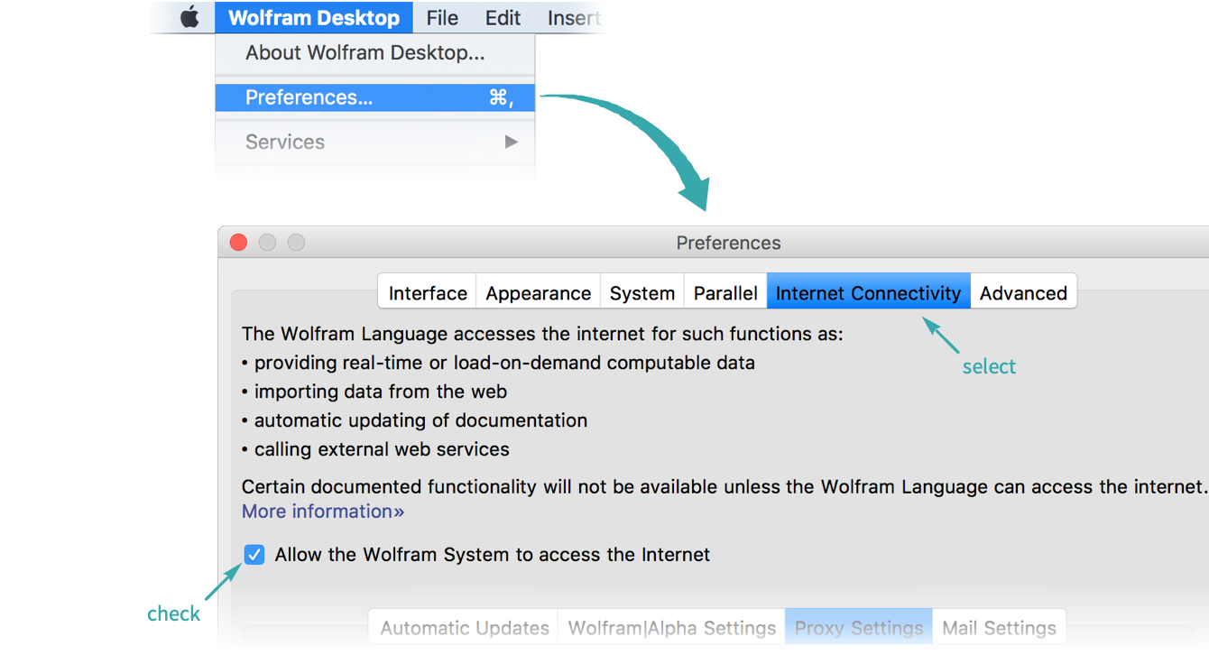 and select the Internet Connectivity tab. Make sure “Allow the Wolfram System to access the internet” is checked: