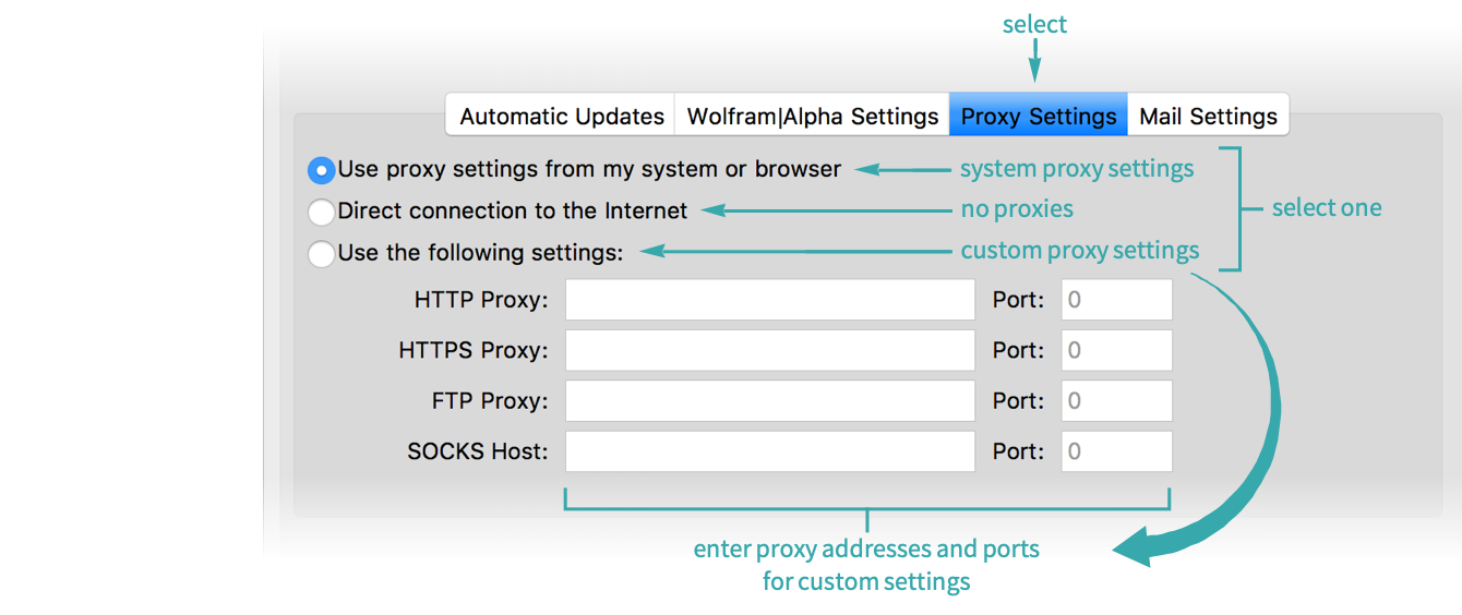 Select the Proxy Settings tab, select the type of proxy settings to use, and enter the proxy configuration: