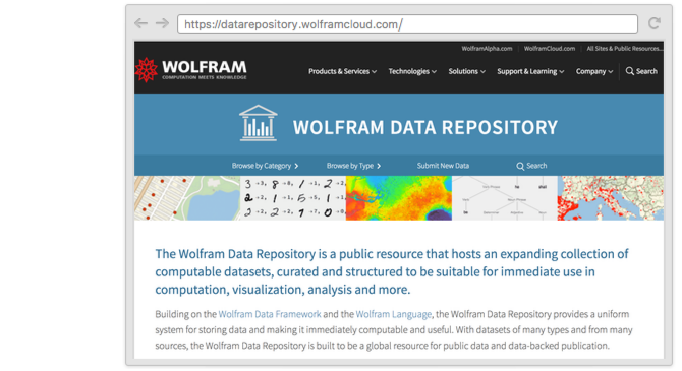 To search, click Search under the Wolfram Data Repository title (not the sitewide Search at the top of the page) and enter a search term:
