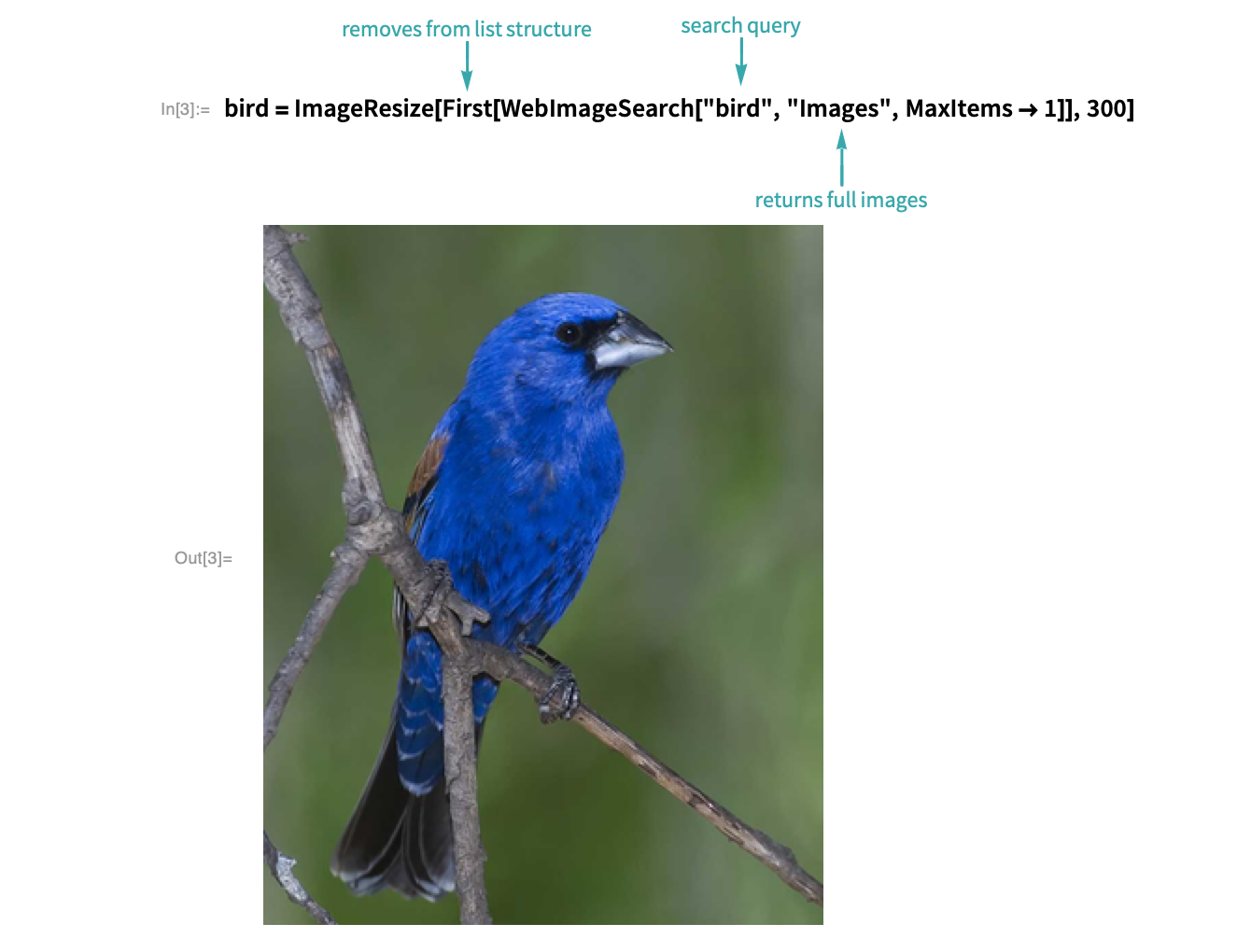 Use WebImageSearch to find an image of a bird and resize it with ImageResize: