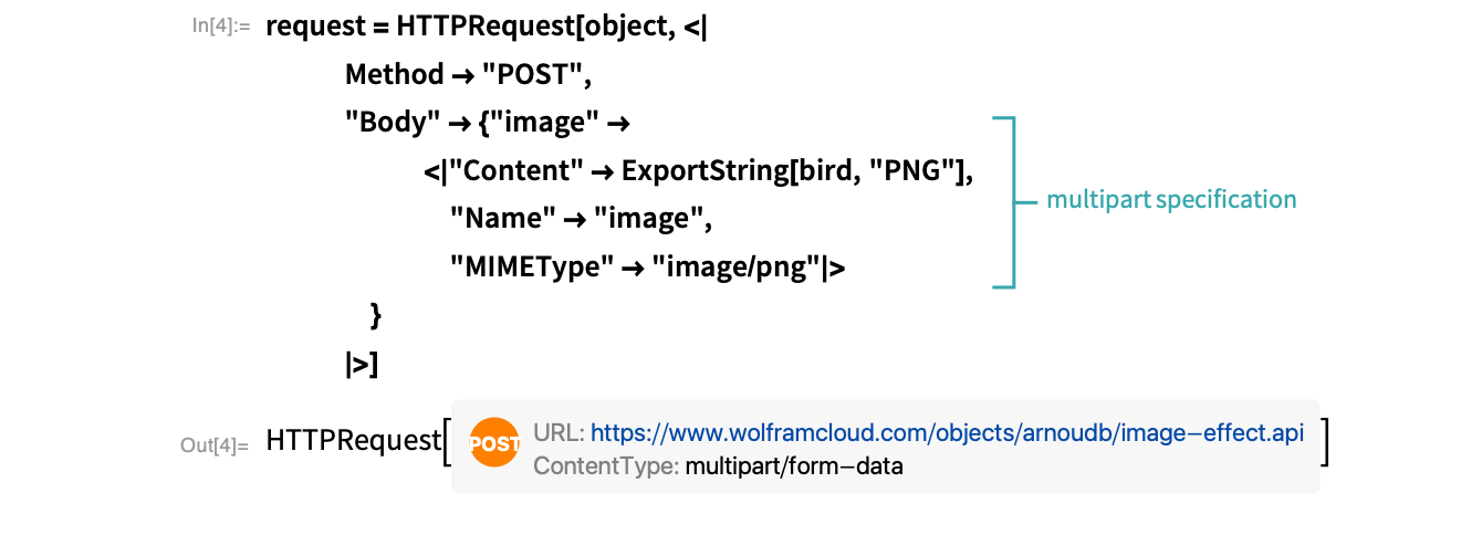 Use HTTPRequest to define a multipart "POST" request for the Wolfram Cloud API server: