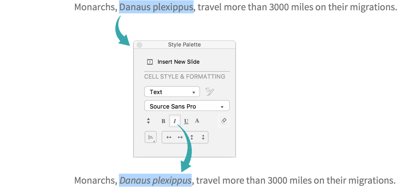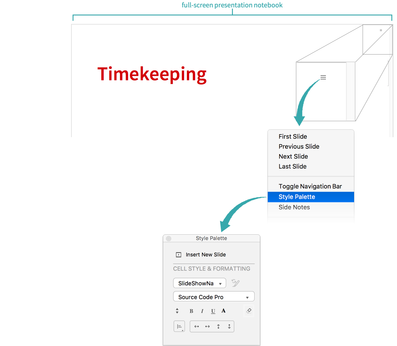 The Style palette is a pop-out version of the formatting toolbar in slideshow working mode.