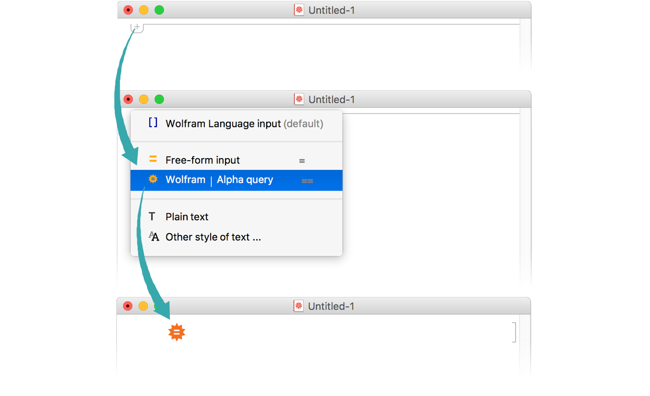 Click the + tab to pop up the input chooser and select Wolfram|Alpha query: